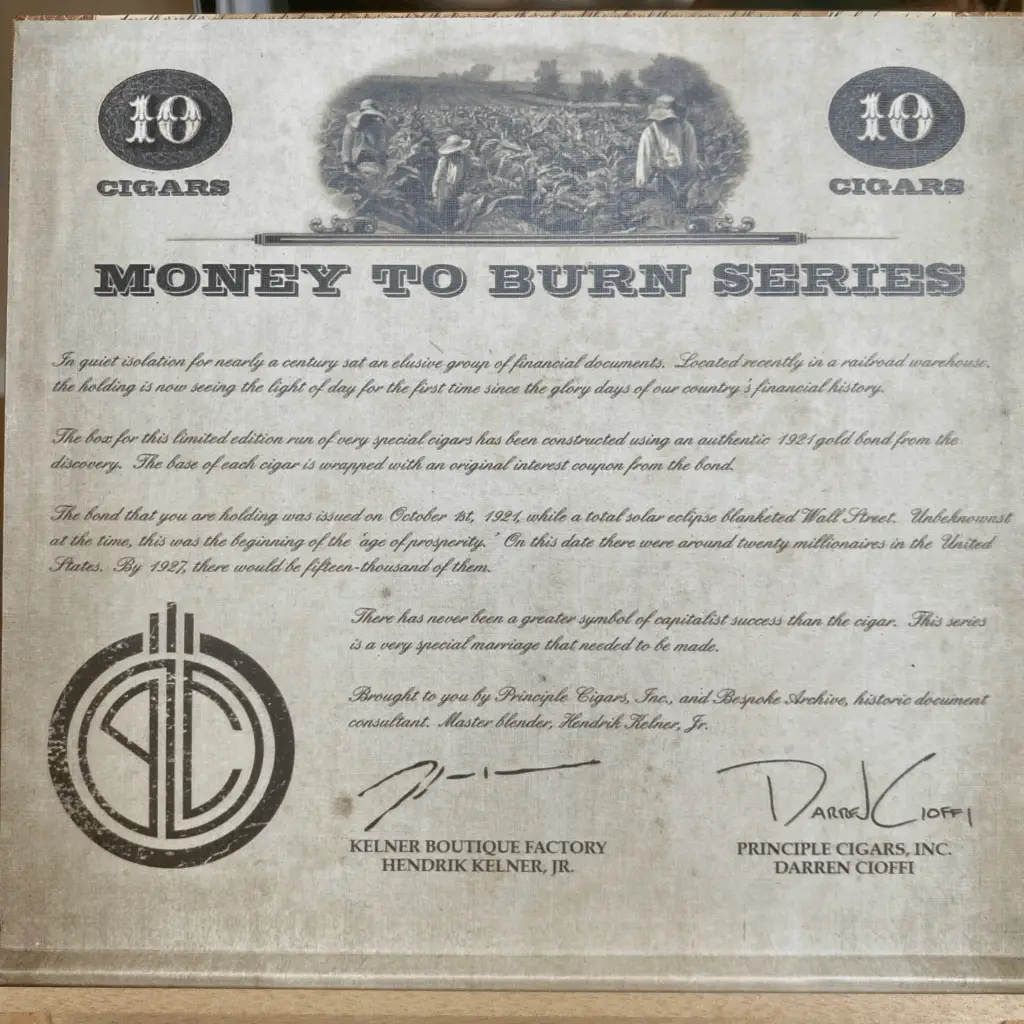 “In 2013, Principle Cigars introduced the most unique offering in premium tobacco: ‘Money-to-Burn’. This exclusive release used original, engraved bond certificates from 1921 in its packaging.”