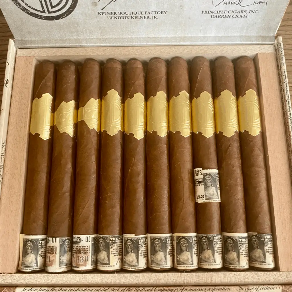 Very unique packaging with bond certificates from 1921. Everything about this box gives off “antique”. The band is all gold with the Principle logo embossed.